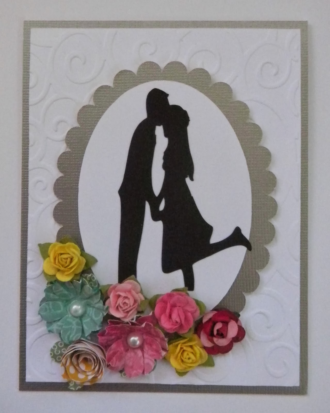 This card was created for my parents anniversary. The kissing couple and the ovals are from the silhouette store. I added some embossing using the divine swirls folder and the 3 flowers in the center I made by hand. I love how pretty this card turned out!